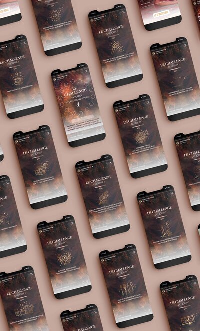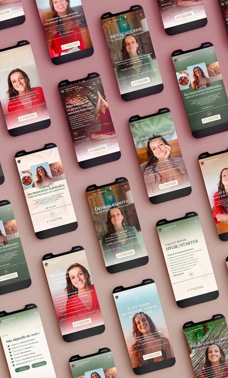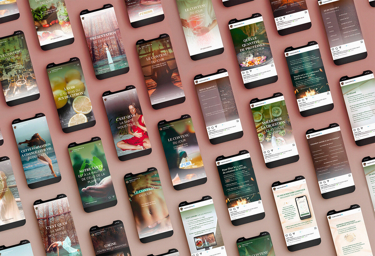Création des supports de communication : carrousel instagram réutilisables, boutons pour le site, visuels marketing et présentation PDF (Figma et Suite Adobe)